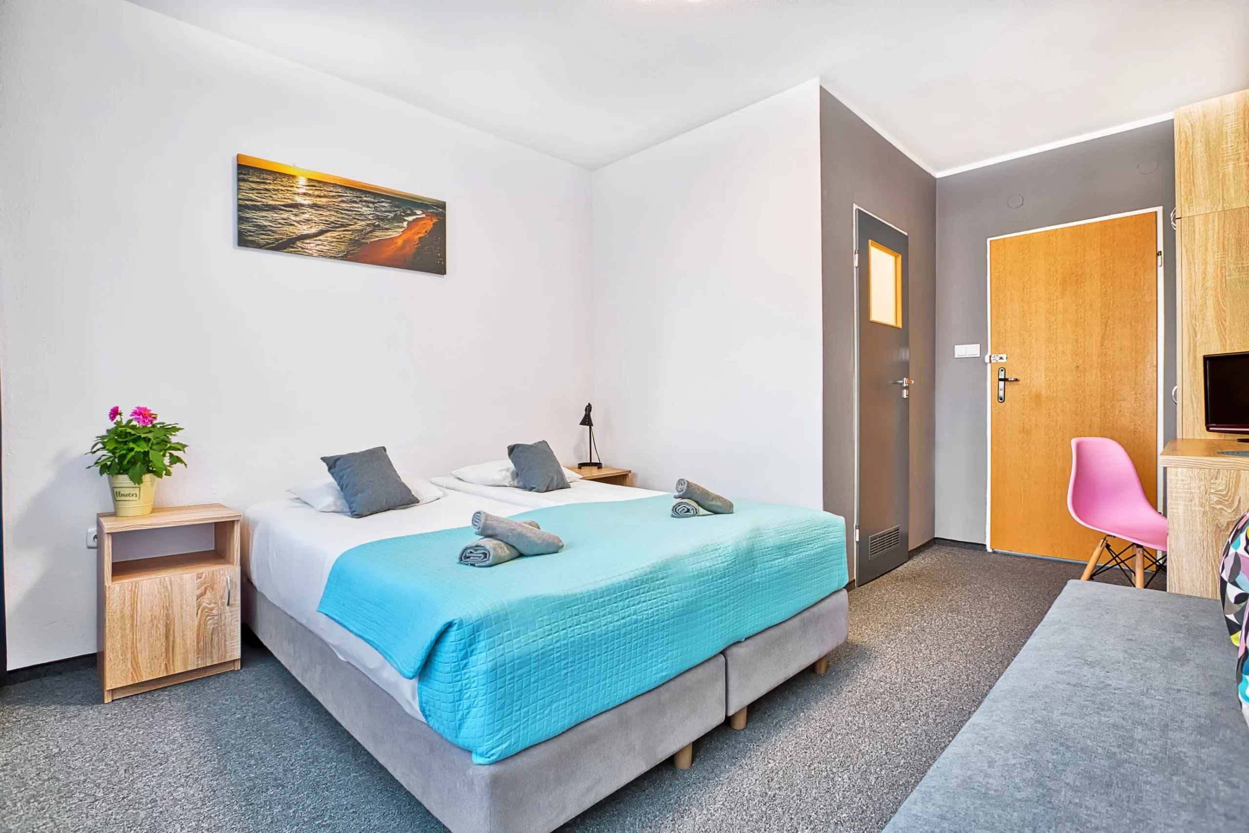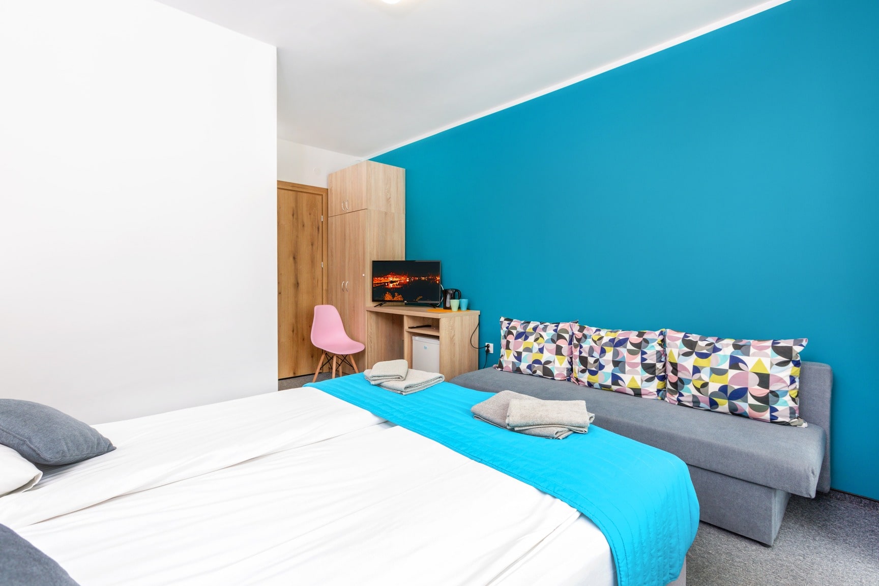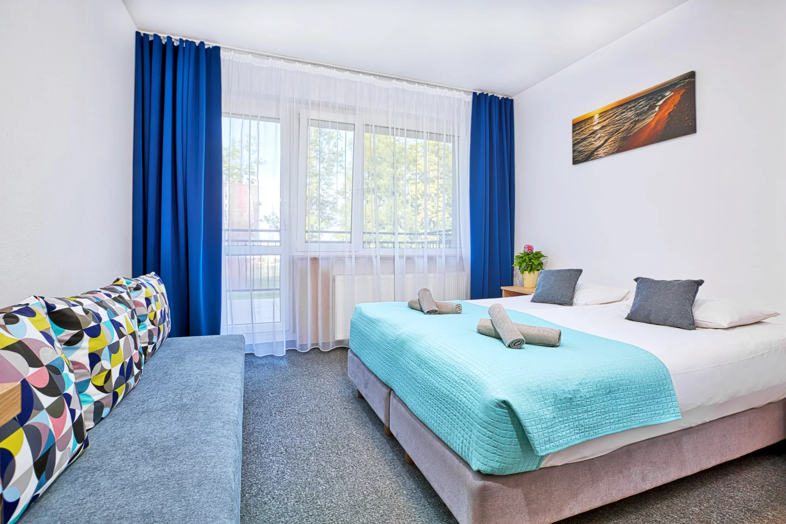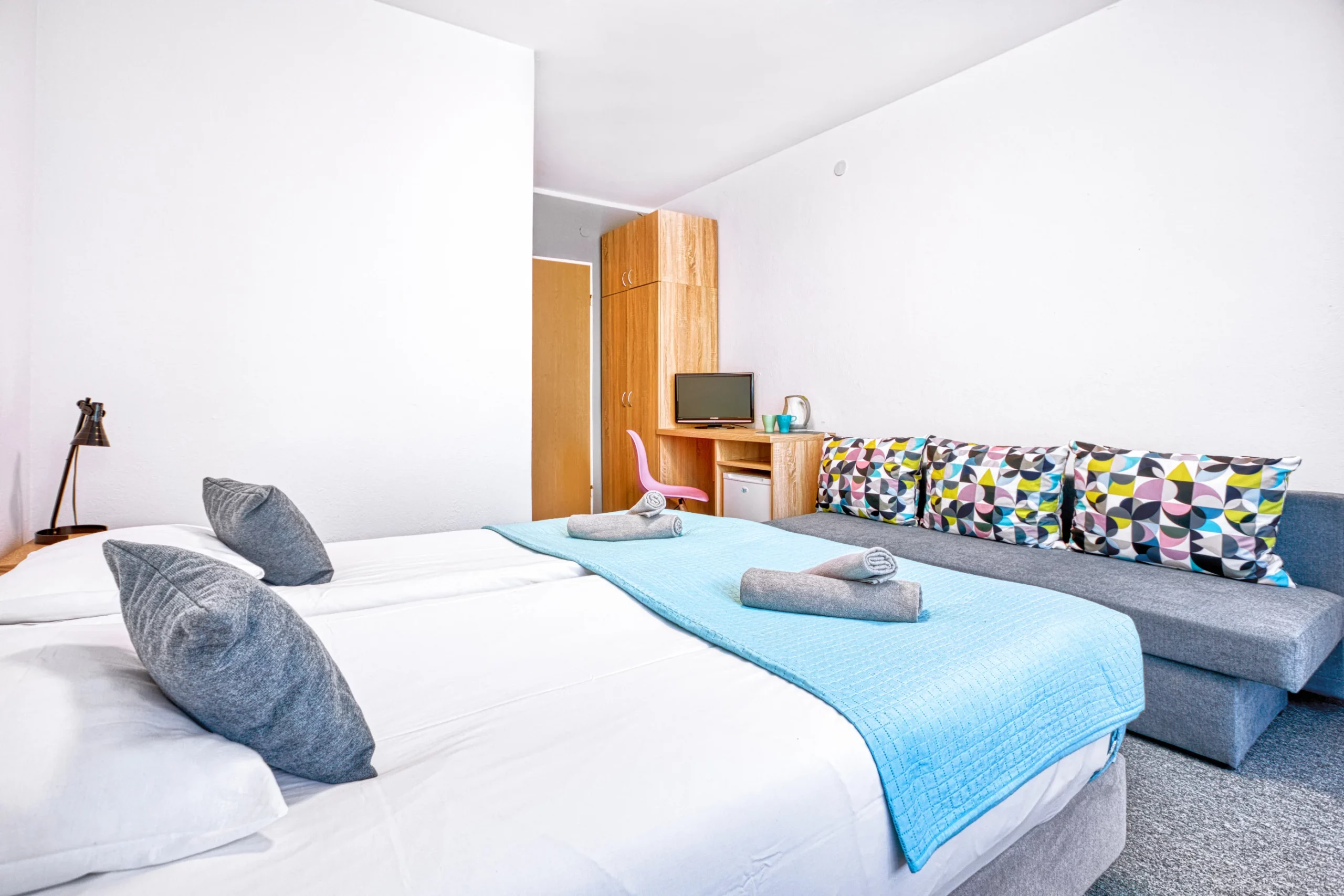 1 rozkładana sofa, 1 duże łóżko podwójne